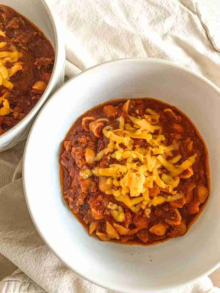 If you prefer to make this chili in a slow cooker, place all the ingredients besides the pasta into a slow cooker. You can still use raw ground beef for this method. Cook the chili on low for 6-8 hours or high for 4-5 hours.
