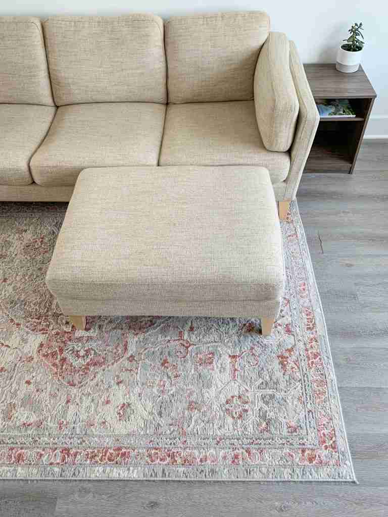 Adding a rug to your living room makes a huge impact when creating a cozy atmosphere. It brings a room together. Choosing the right rug is so important. Make sure you pick the perfect size for your furniture and room size. The general rule is to keep the furniture’s front legs on the rug. If you have a longer room as we do, keep the tv stand off the rug and create a sitting space to the side with your accent chairs.