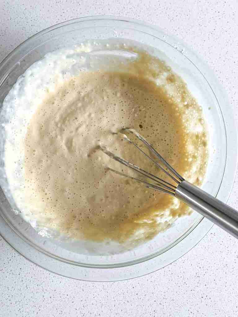 - Add in flour and whisk until just combined. Do not over mix or your pancakes will be tough.