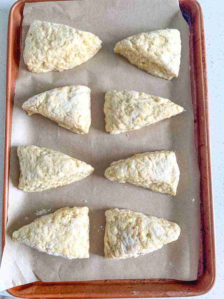 - Slice the dough into 8 pieces like a pie, placing them 2 inches apart on a large sheet pan lined with parchment paper.