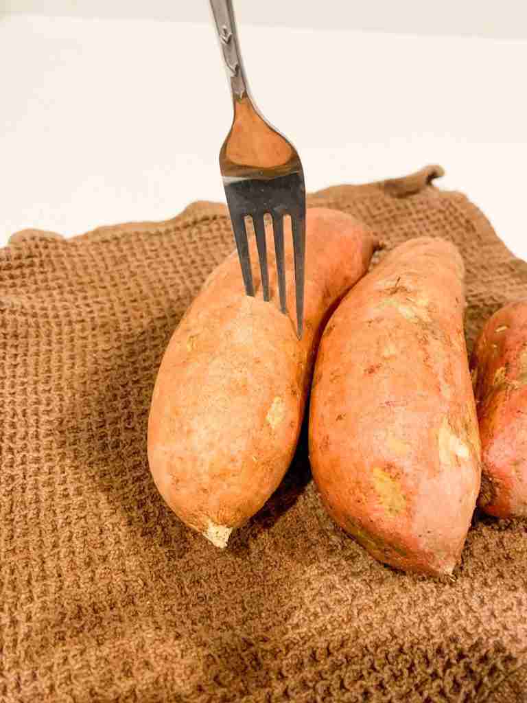 - 1.5 hours before it’s done, rinse sweet potatoes and poke them all the way around with a fork.