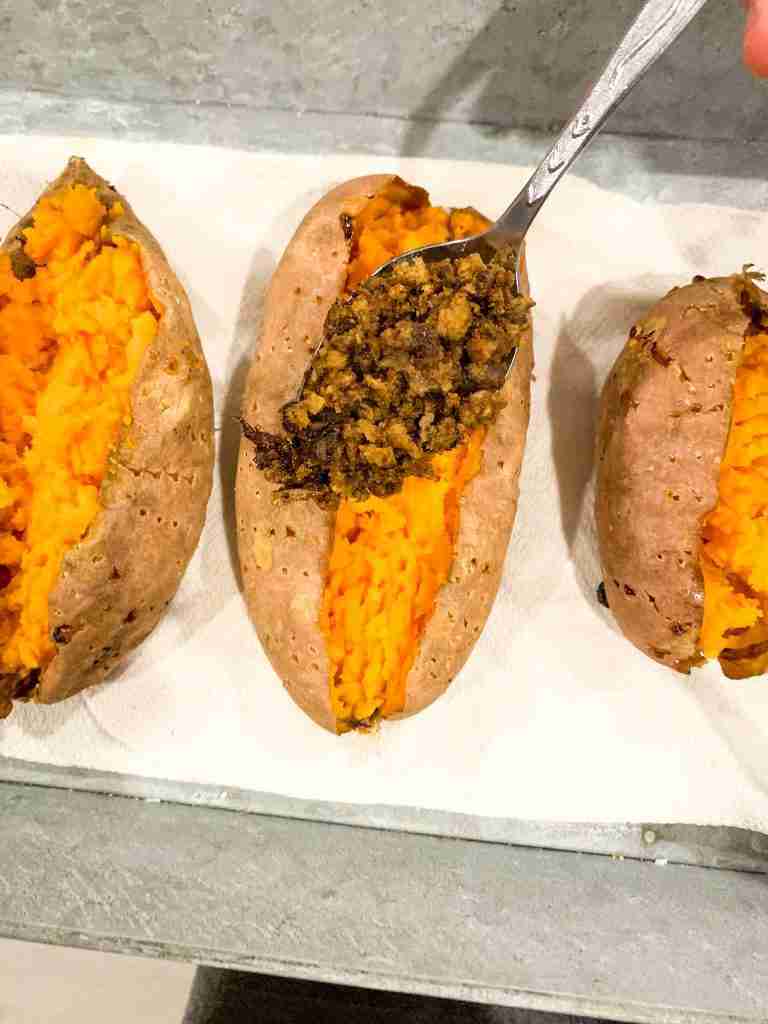 - Uncover taco meat, stir, and add it to the sweet potatoes.